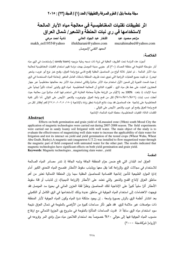 اثر تطبيقات تقنيات المغناطيسية في معالجة مياه الآبار المالحة