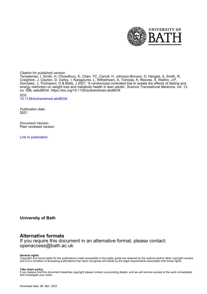 A Randomized Controlled Trial To Isolate The Effects Of Fasting And Energy Restriction On Weight Loss And Metabolic Health In Lean Adults