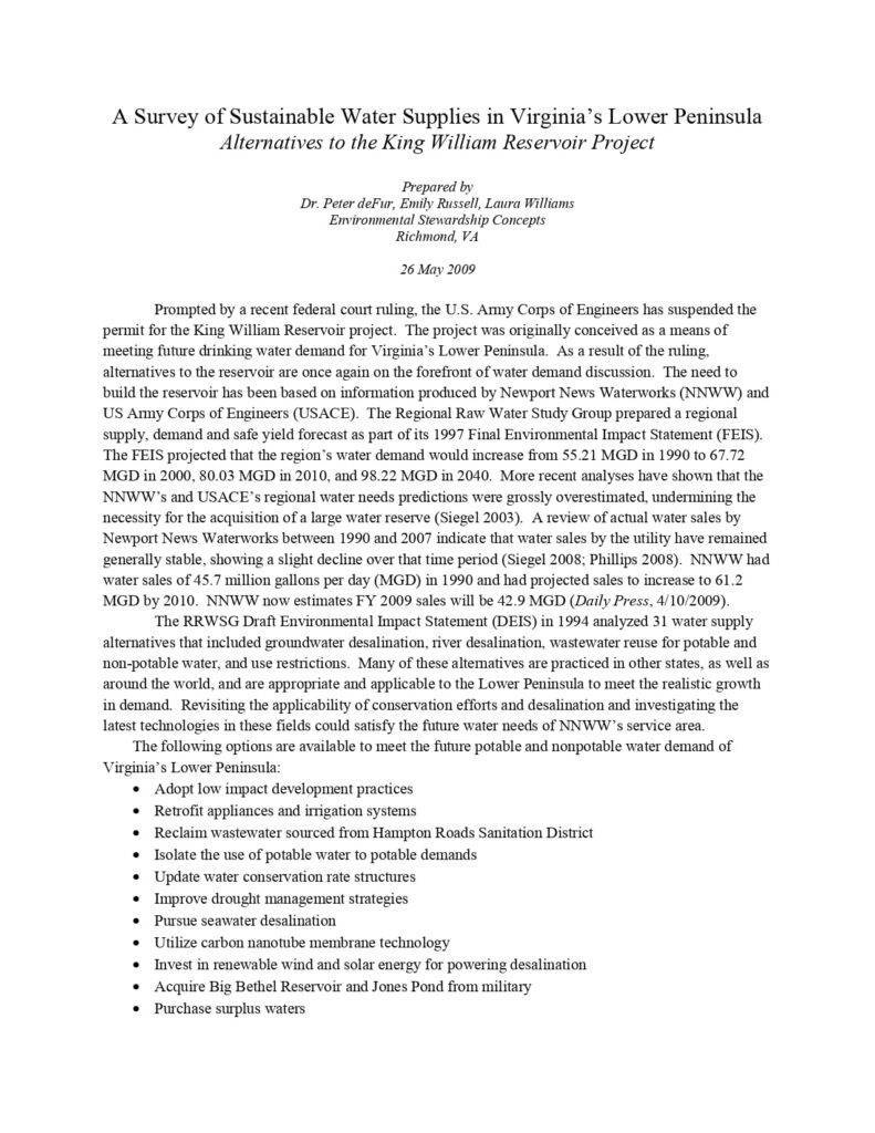 A Survey Of Sustainable Water Supplies In Virginia’s Lower Peninsula Alternatives To The King William Reservoir Project