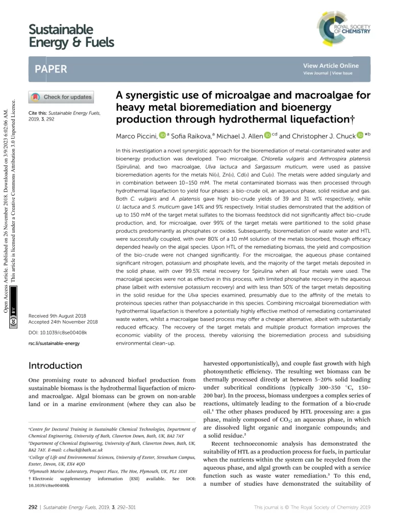 A Synergistic Use Of Microalgae And Macroalgae For Heavy Metal Bioremediation And Bioenergy Production Through Hydrothermal Liquefaction