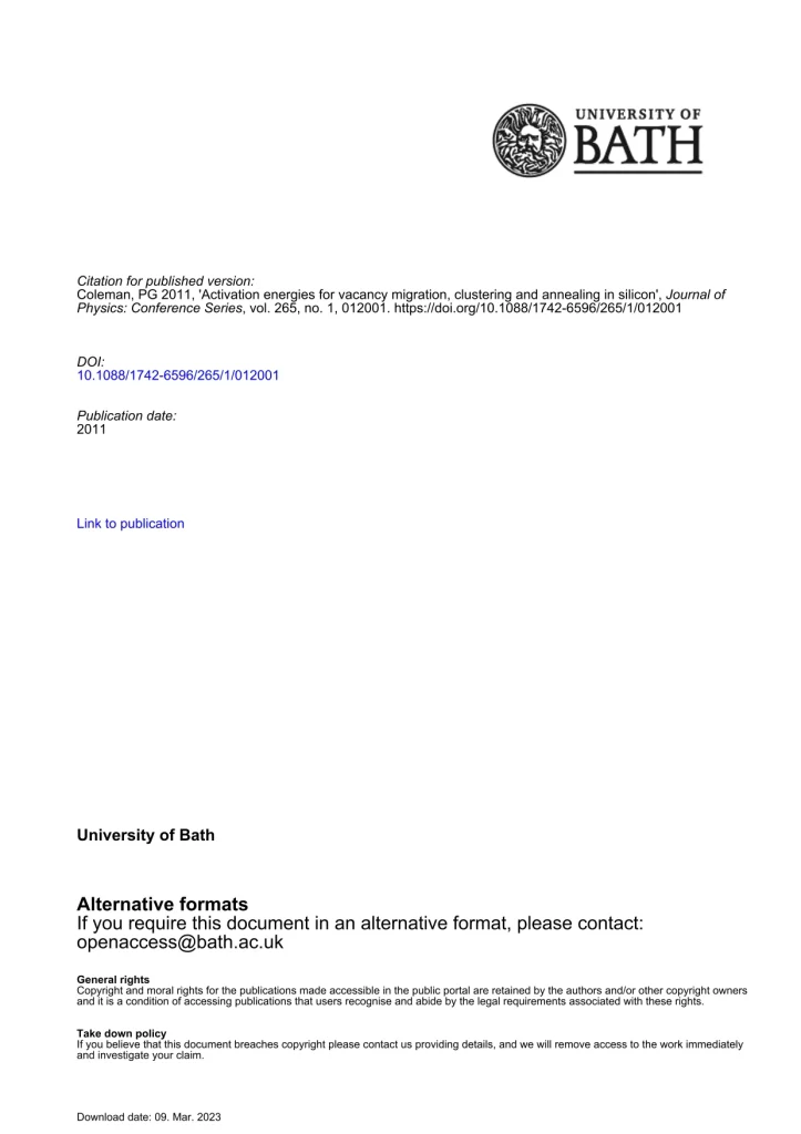 Activation Energies For Vacancy Migration, Clustering And Annealing In Silicon