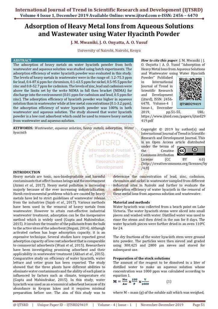 Adsorption Of Heavy Metal Ions From Aqueous Solutions And Wastewater Using Water Hyacinth Powder