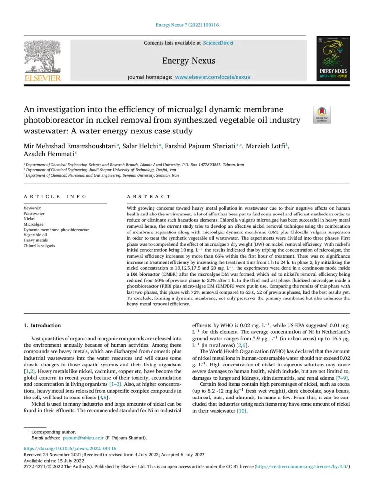 An Investigation Into The Efficiency Of Microalgal Dynamic Membrane Photobioreactor In Nickel Removal From Synthesized Vegetable Oil Industry Wastewater: A Water Energy Nexus Case Study