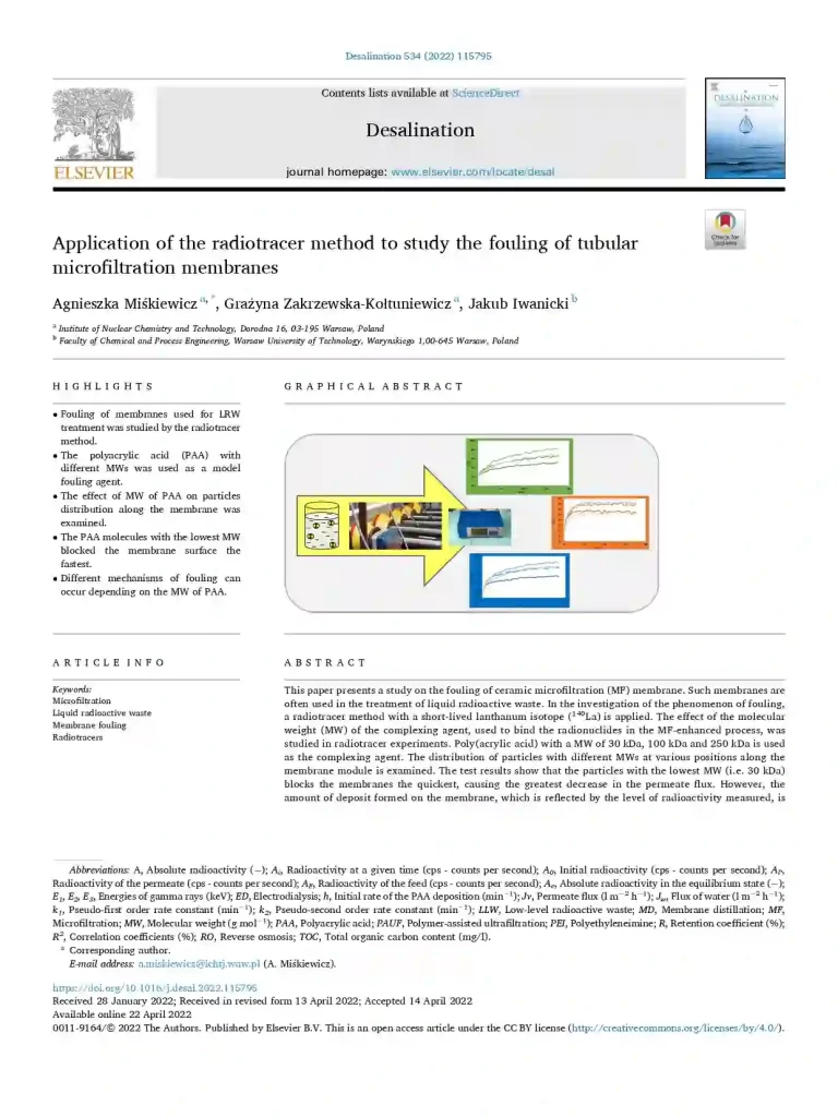 Application of the radiotracer method to study the fouling of tubular microfiltration membranes