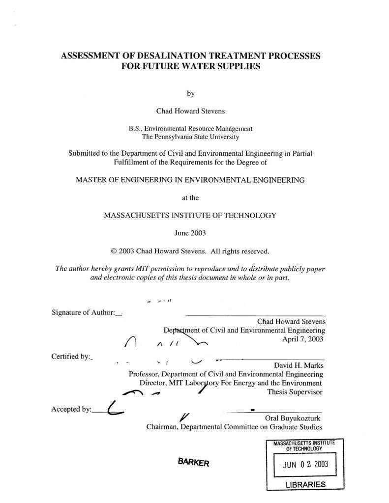 Assessment Of Desalination Treatment Processes For Future Water Supplies