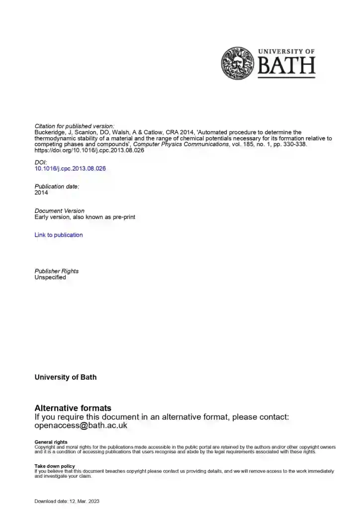 Automated procedure to determine the thermodynamic stability of a material and the range of chemical potentials necessary for its formation relative to competing phases and compounds