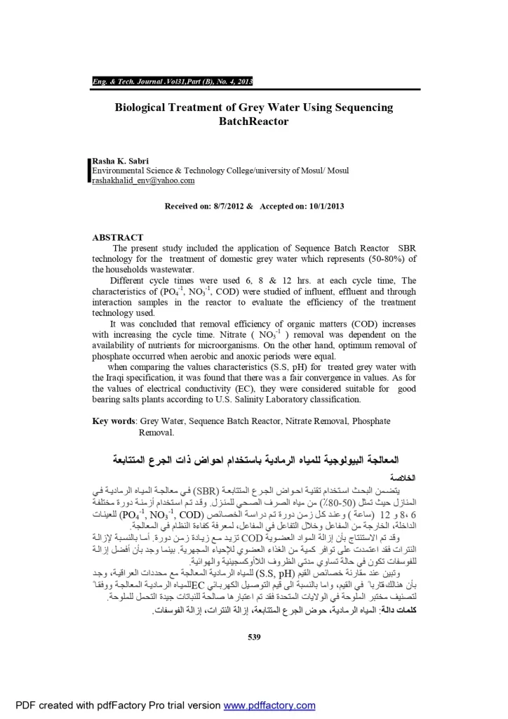 Biological Treatment of Grey Water Using Sequencing BatchReactor