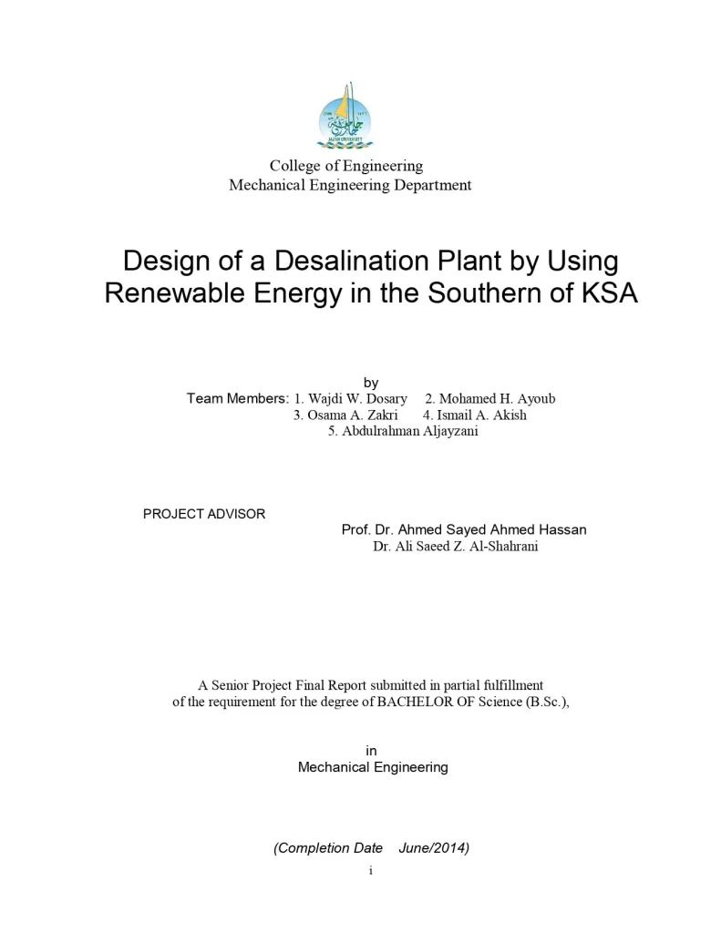 Design of a Desalination Plant by Using Renewable Energy in the Southern of KSA