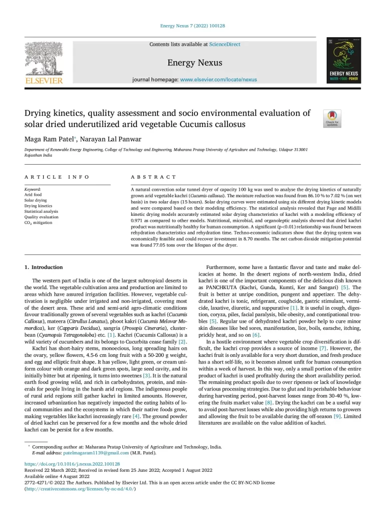 Drying Kinetics, Quality Assessment And Socio Environmental Evaluation Of Solar Dried Underutilized Arid Vegetable Cucumis Callosus