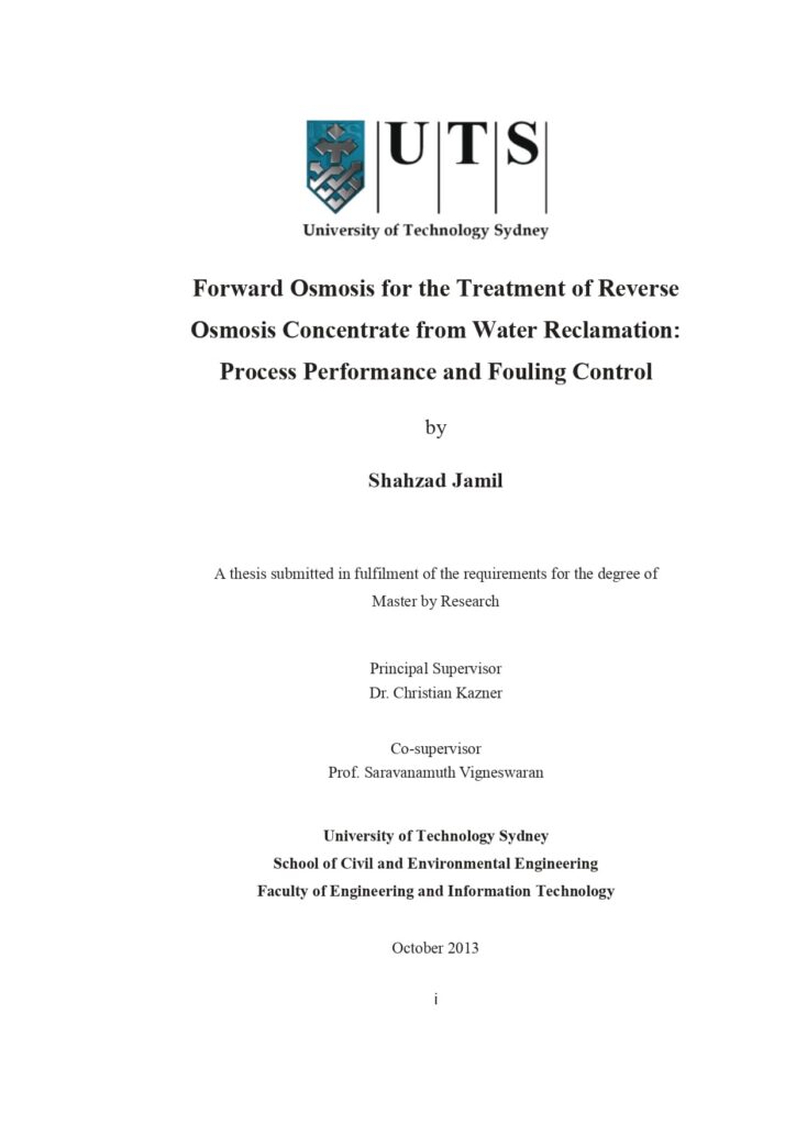 Forward Osmosis for the Treatment of Reverse Osmosis Concentrate from Water Reclamation Process Performance and Fouling Control