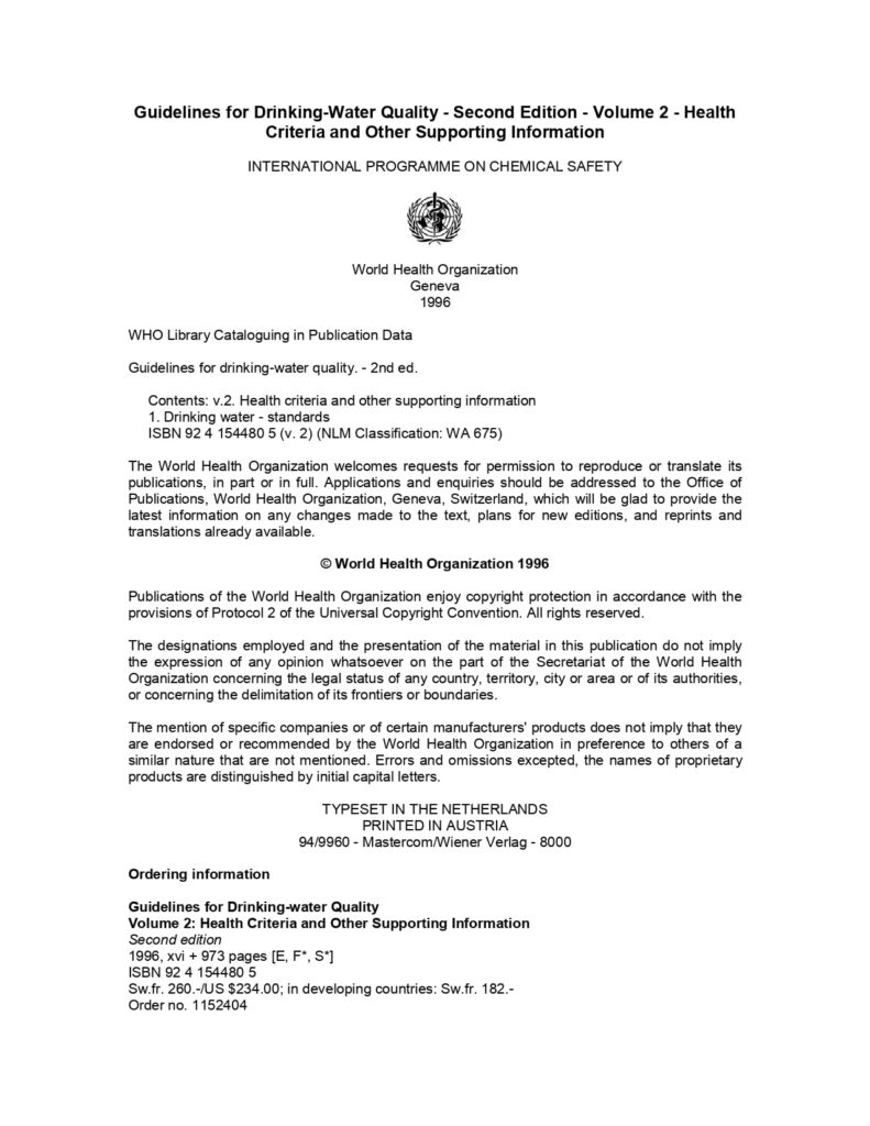 Guidelines for Drinking-Water Quality – Second Edition – Volume 2 -Health Criteria and Other Supporting Information