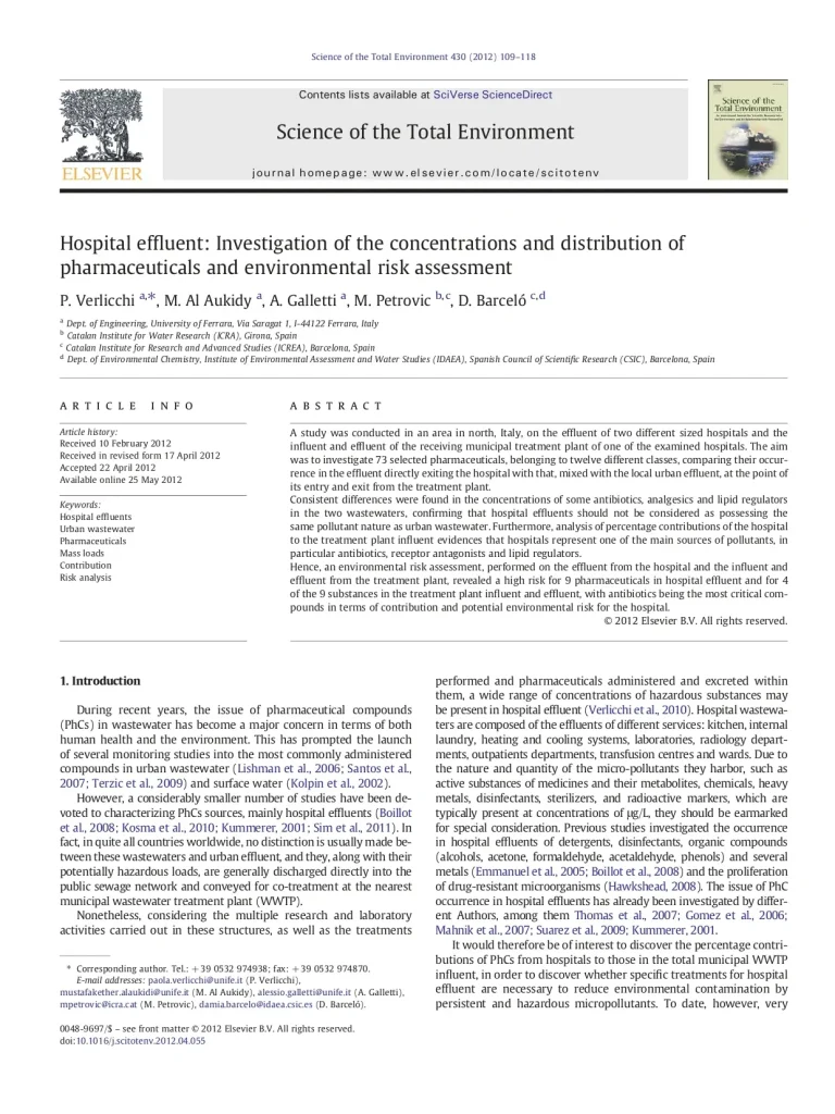 Author: P. Verlicchi , M. Al Aukidy , A. Galletti , M. Petrovic, D. Barceló
