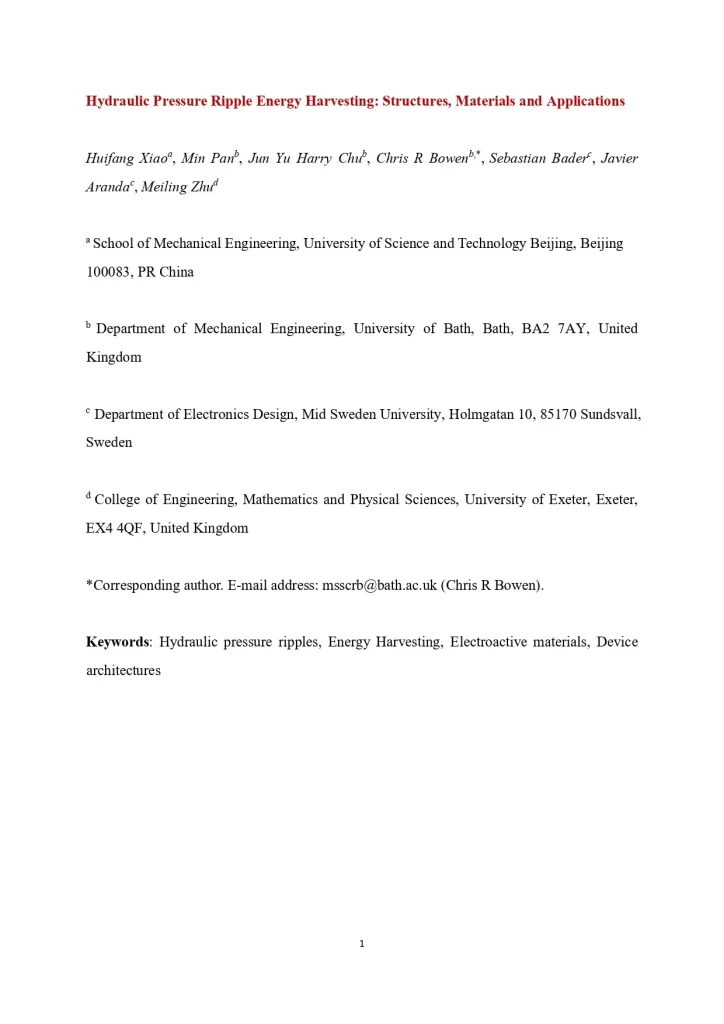 Hydraulic Pressure Ripple Energy Harvesting: Structures, Materials and Applications