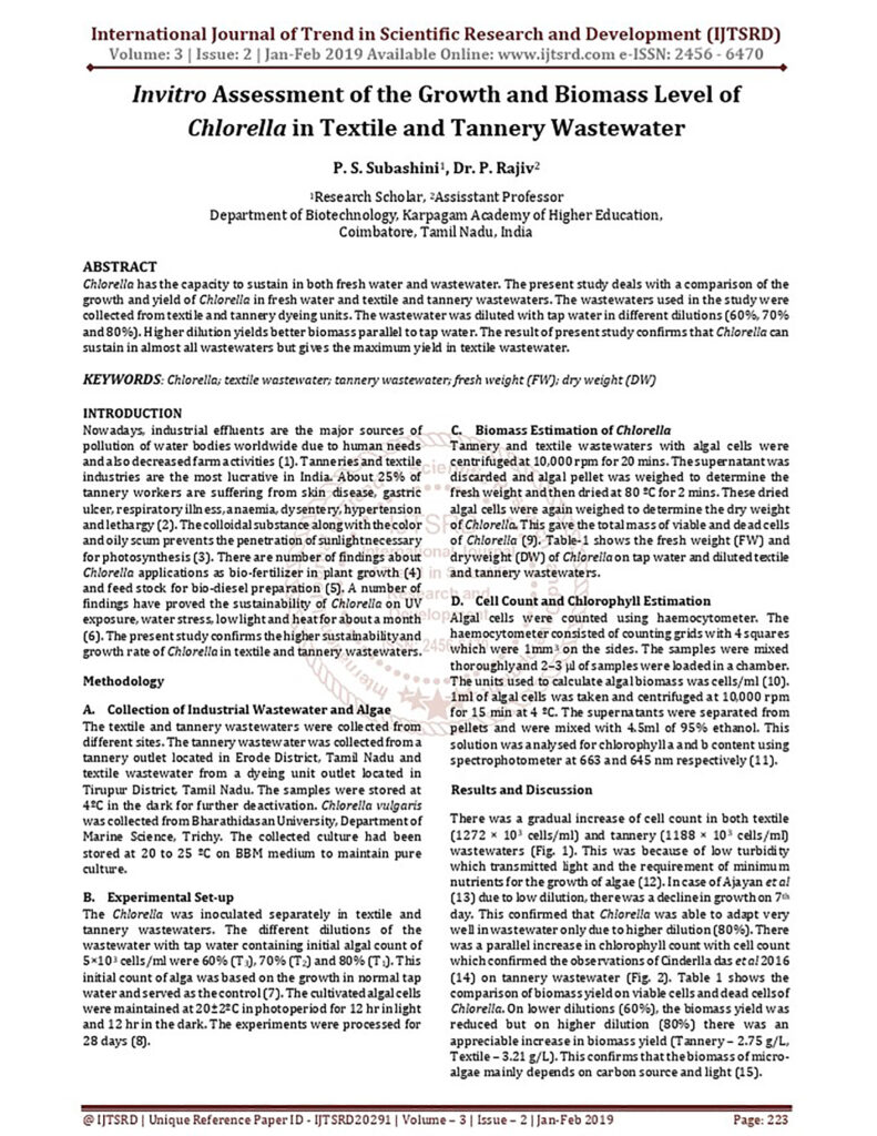 Invitro Assessment Of The Growth And Biomass Level Of Chlorella In Textile And Tannery Wastewater