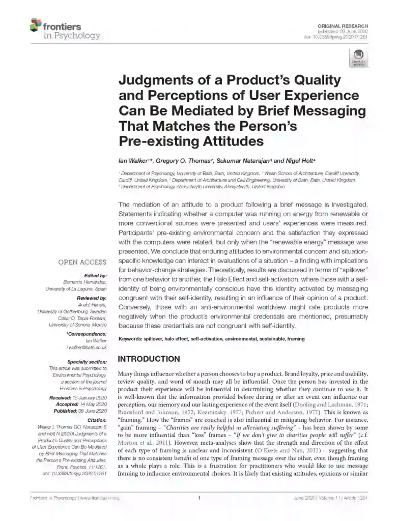 Judgments of a Product’s Quality and Perceptions of User Experience Can Be Mediated by Brief Messaging That Matches the Person’s Pre-existing Attitudes