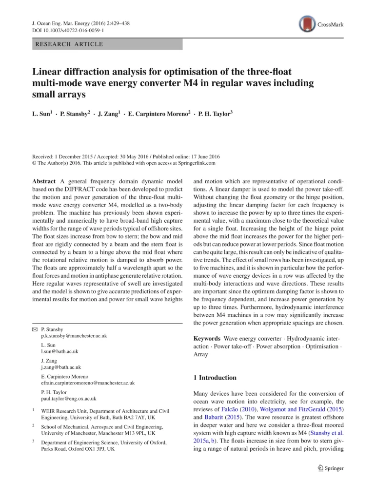 Linear Diffraction Analysis For Optimisation Of The Three-Float Multi-Mode Wave Energy Converter M4 In Regular Waves Including Small Arrays