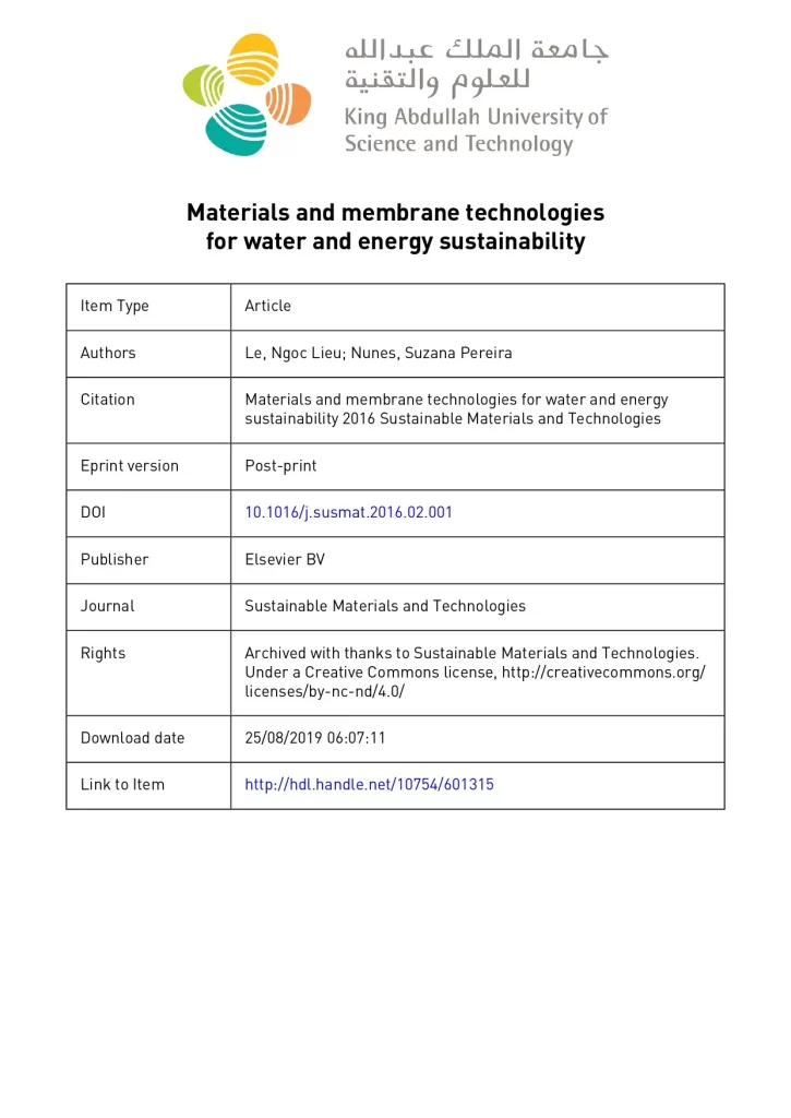 Materials and Membrane Technologies for Water and Energy Sustainability