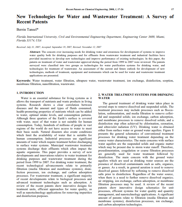 New Technologies for Water and Wastewater Treatment A Survey of Recent Patents