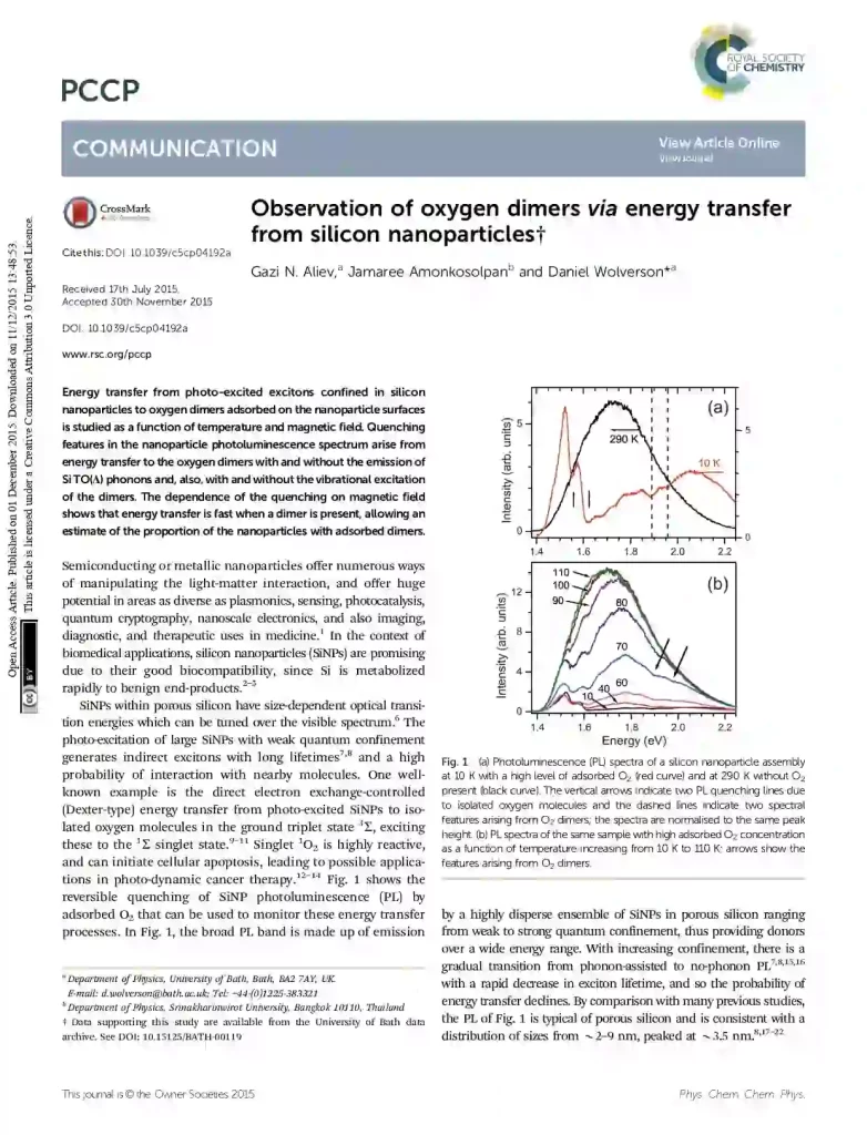 Observation of Oxygen Dimers via Energy Transfer from Silicon Nanoparticles