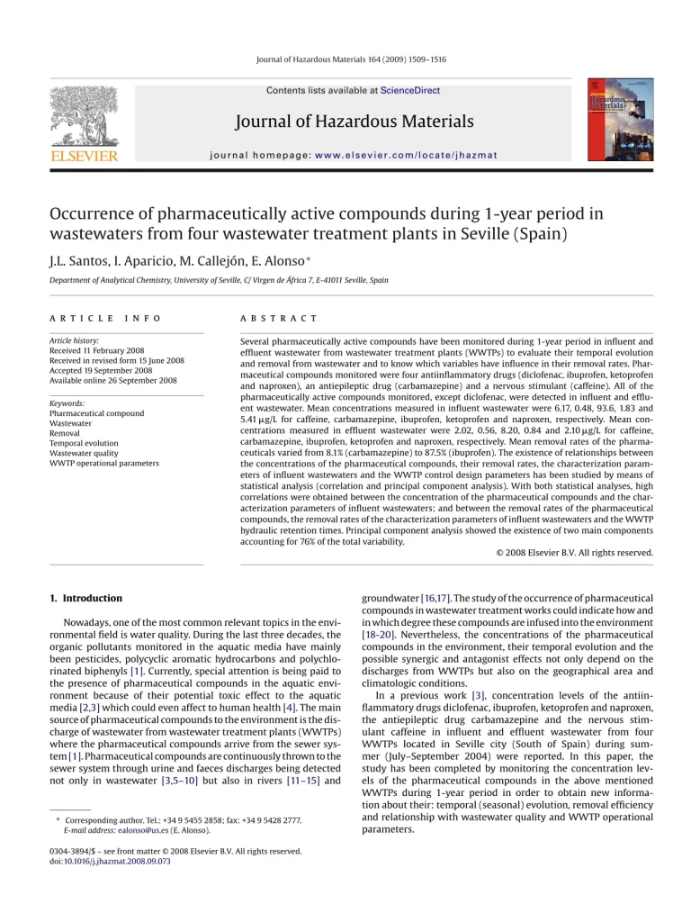 Occurrence of Pharmaceutically Active Compounds During 1-Year Period in Wastewaters from Four Wastewater Treatment Plants in Seville (Spain)
