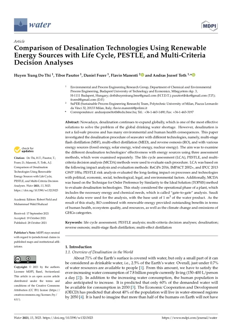 Comparison of Desalination Technologies Using Renewable Energy Sources with Life Cycle, PESTLE, and Multi-Criteria Decision Analyses 5 2 View details Download