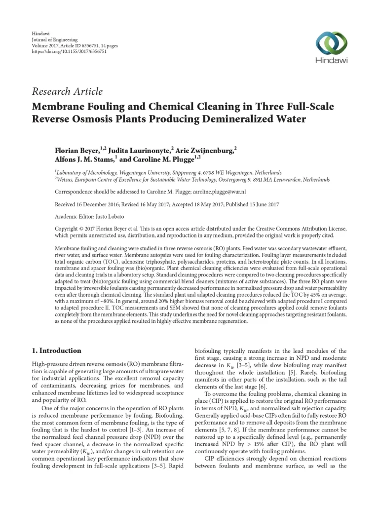 Membrane Fouling and Chemical Cleaning in Three Full-Scale Reverse Osmosis Plants Producing Demineralized Water 6 2 View details Download