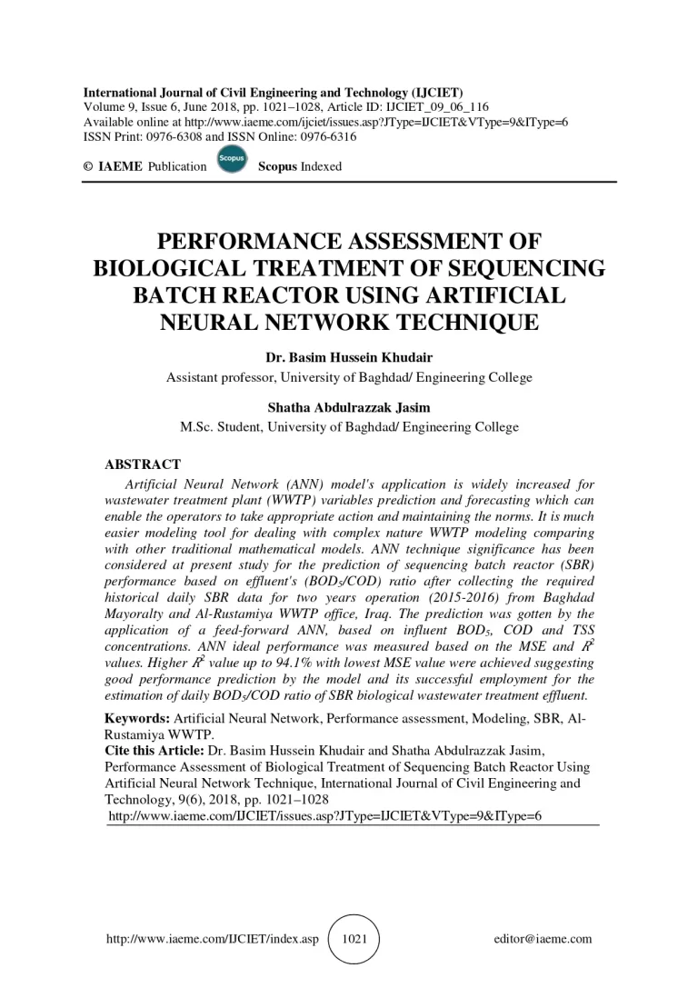 Performance Assessment of Biological Treatment of Sequencing Batch Reactor Using Artificial Neural Network Technique 6 2 View details Download
