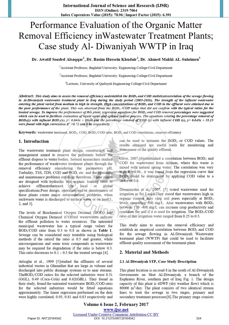 Performance Evaluation of The Organic Matter Removal Efficiency in Wastewater Treatment Plants – Case Study Al- Diwaniyah WWTP in Iraq 3 1 View details Download