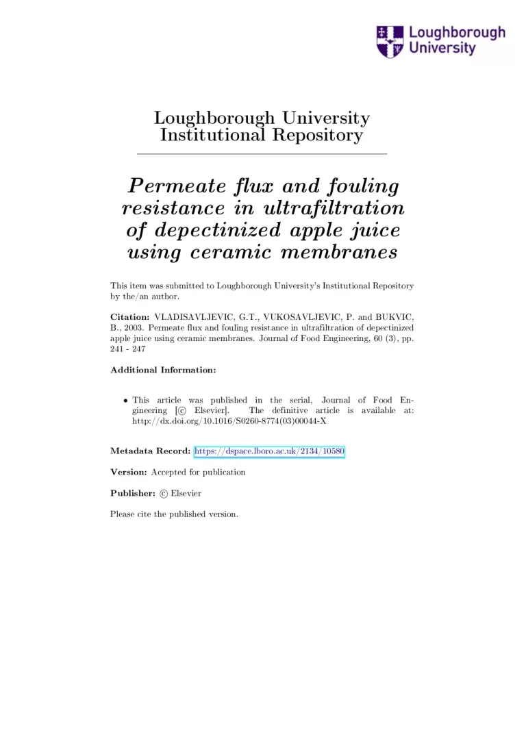 Permeate Flux and Fouling Resistance in Ultrafiltration of Depectinized Apple Juice Using Ceramic Membranes 7 2 View details Download