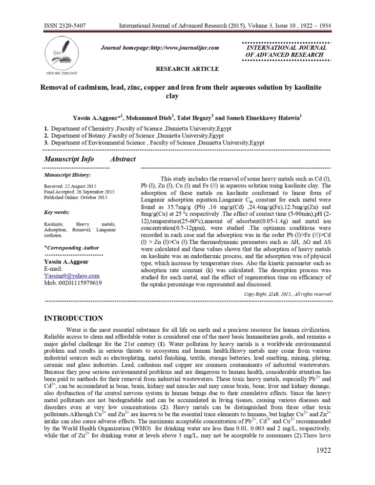 Removal of Cadmium, Lead, Zinc, Copper and Iron from Their Aqueous Solution by Kaolinite Clay 36 27 View details Download