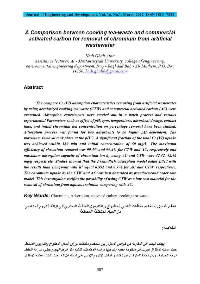 A Comparison Between Cooking Tea-Waste And Commercial Activated Carbon For Removal Of Chromium From Artificial Wastewater 48 23 View details Download