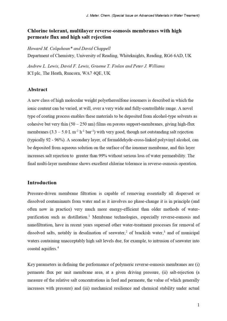 Chlorine Tolerant, Multilayer Reverse-Osmosis Membranes With High Permeate Flux And High Salt Rejection 29 14 View details Download