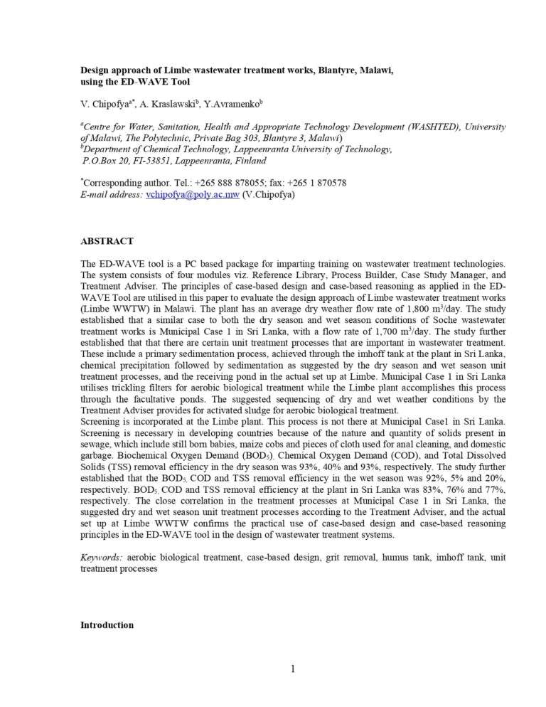 Design Approach Of Limbe Wastewater Treatment Works, Blantyre, Malawi, Using The ED-WAVE Tool 32 13 View details Download