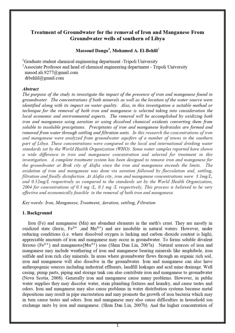 Treatment Of Groundwater For the Removal of Iron and Manganese From Groundwater wells of southern of Libya 4 1 View details Download