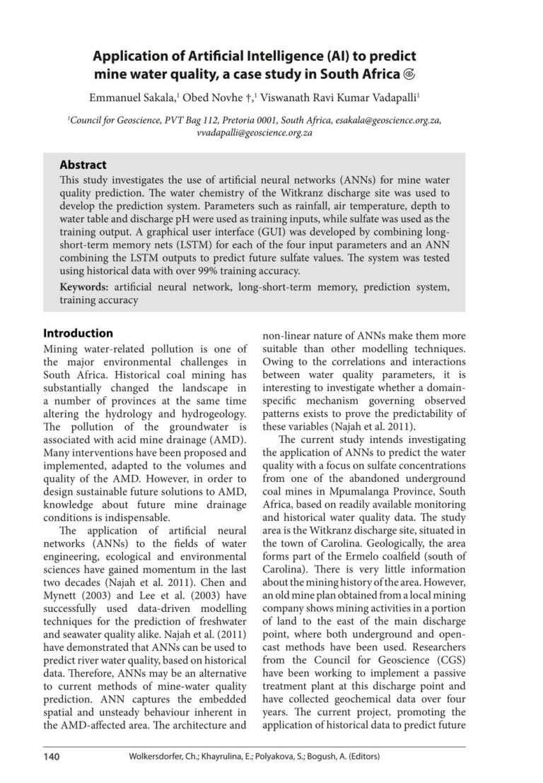 Application of Artificial Intelligence (AI) to Predict Mine Water Quality, a Case Study in South Africa 32 11 View details Download