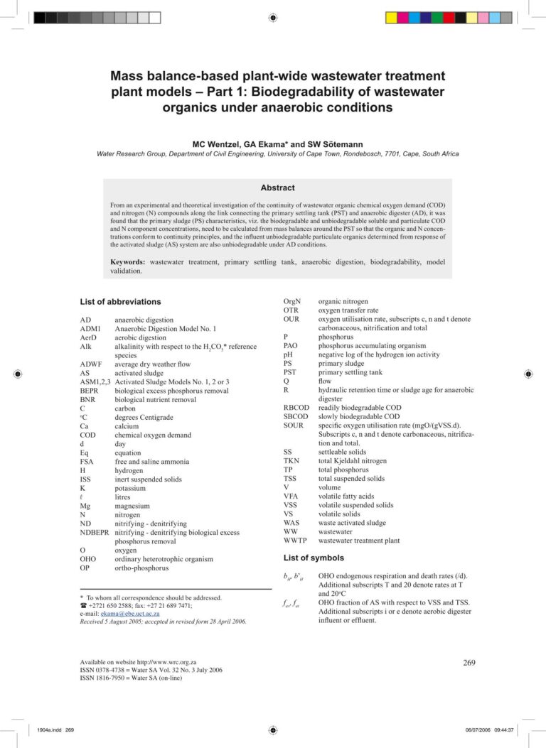 Mass Balance-Based Plant-Wide Wastewater Treatment Plant Models – Part 1 Biodegradability Of Wastewater Organics Under Anaerobic Conditions 43 28 View details Download