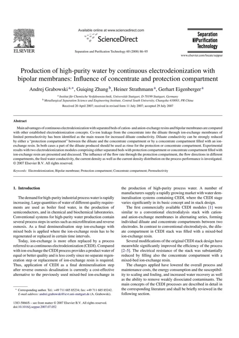 The Production Of High Purity Water By Continuous Electrodeionization With Bipolar Membranes Influence Of The Anion-Exchange Membrane Permselectivity 32 31 View details Download