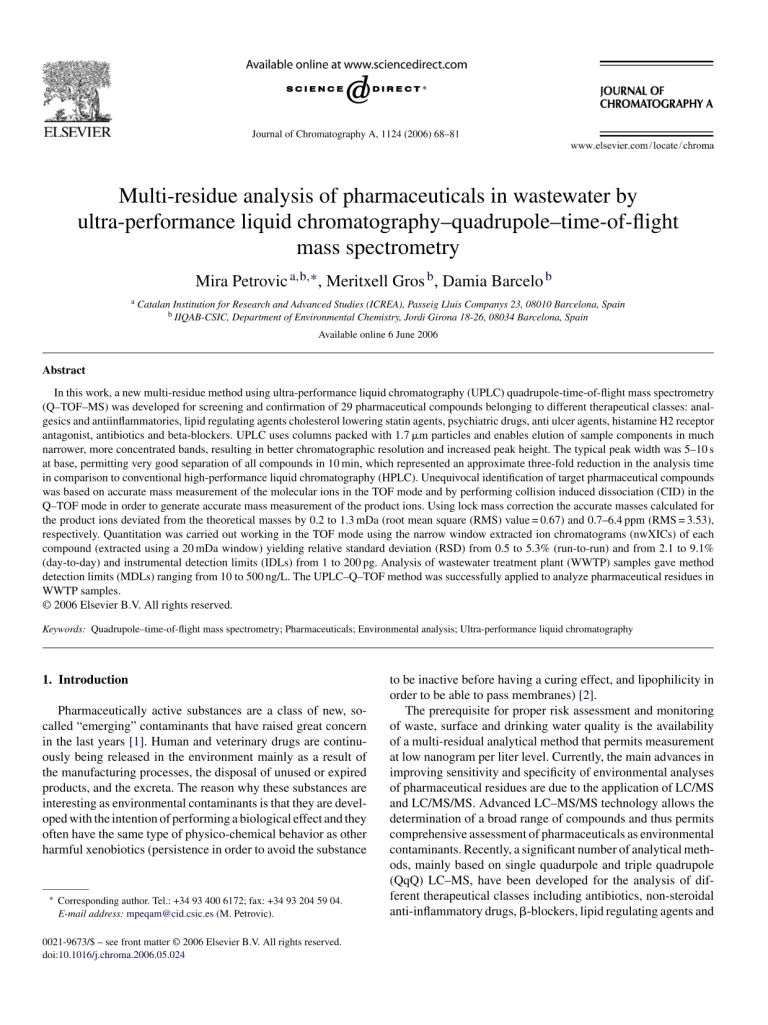 Multi Residue Analysis of Pharmaceuticals in Wastewater by Ultra Performance Liquid Chromatography Quadrupole Time of Flight Mass Spectrometry 38 25 View details Download