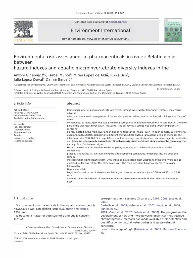 Environmental Risk Assessment of Pharmaceuticals in Rivers Relationships between Hazard Indexes and Aquatic Macroinvertebrate Diversity Indexes in the Llobregat River (NE Spain) 44 32 View details Download