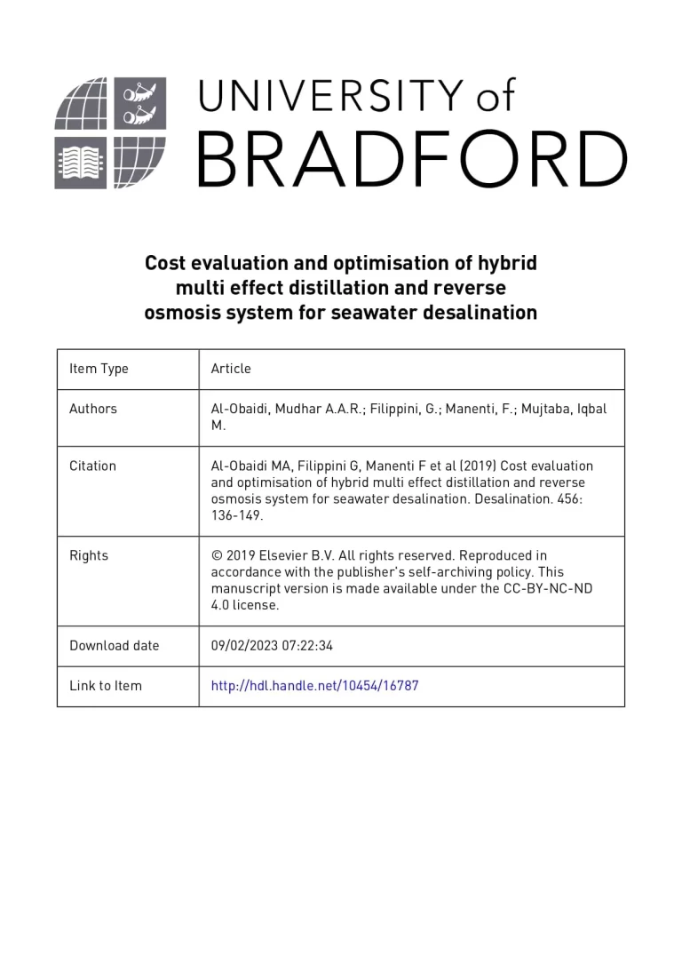 Cost Evaluation and Optimisation of Hybrid Multi Effect Distillation and Reverse Osmosis System for Seawater Desalination 40 29 View details Download