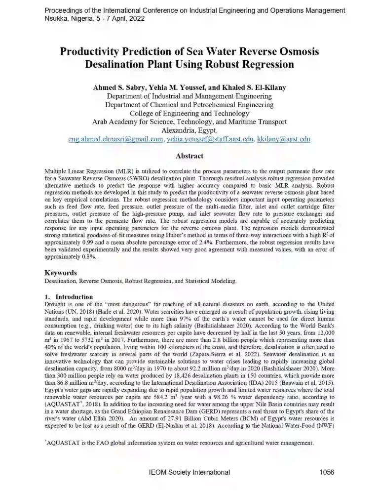 Productivity Prediction of Sea Water Reverse Osmosis Desalination Plant Using Robust Regression 40 26 View details Download