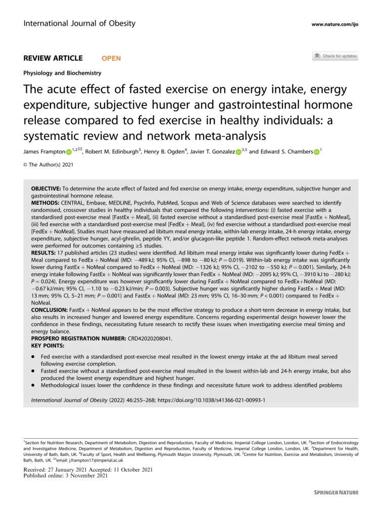 The Acute Effect Of Fasted Exercise On Energy Intake, Energy Expenditure, Subjective Hunger And Gastrointestinal Hormone Release Compared To Fed Exercise In Healthy Individuals 53 36 View details Download