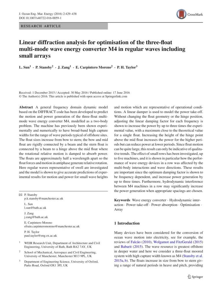 Linear Diffraction Analysis For Optimisation Of The Three-Float Multi-Mode Wave Energy Converter M4 In Regular Waves Including Small Arrays 42 17 View details Download