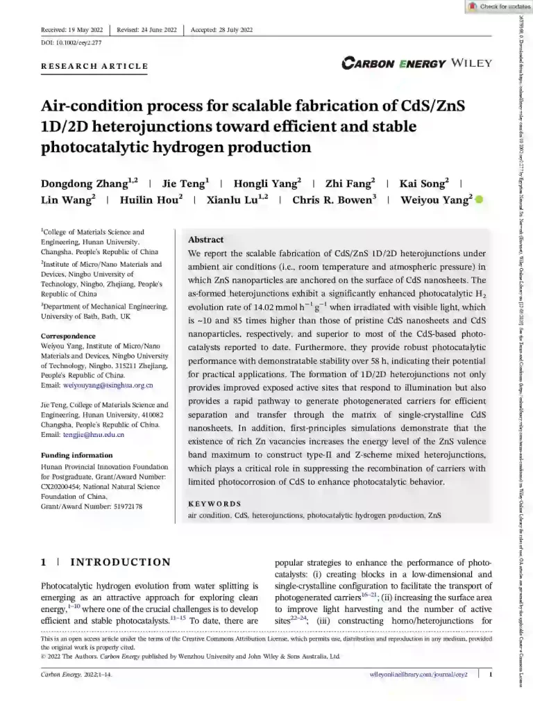 Air‐Condition Process for Scalable Fabrication of Cds/Zns 1D/2D Heterojunctions Toward Efficient and Stable Photocatalytic Hydrogen Production 48 37 View details Download