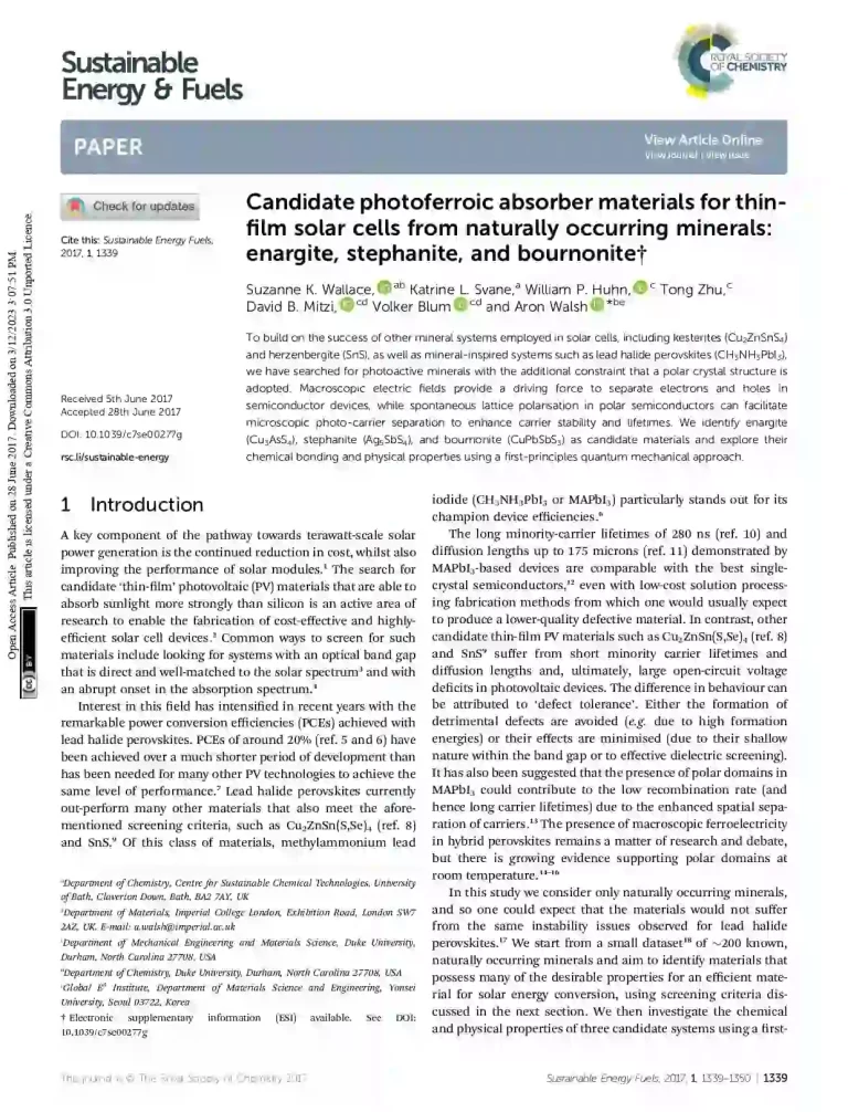 Candidate Photoferroic Absorber Materials for Thin Film Solar Cells from Naturally Occurring Minerals: Enargite, Stephanite, and Bournonite 33 10 View details Download