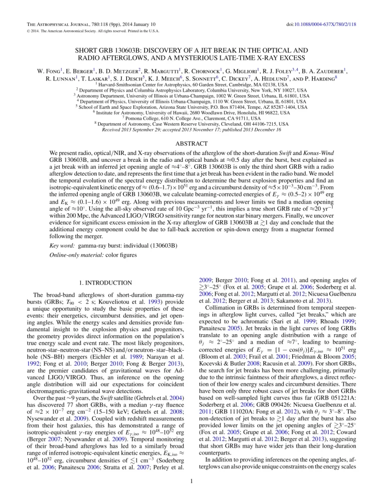 Short GRB 130603B – Discovery Of A Jet Break In The Optical And Radio Afterglows, And A Mysterious Late-Time X-Ray Excess 39 16 View details Download