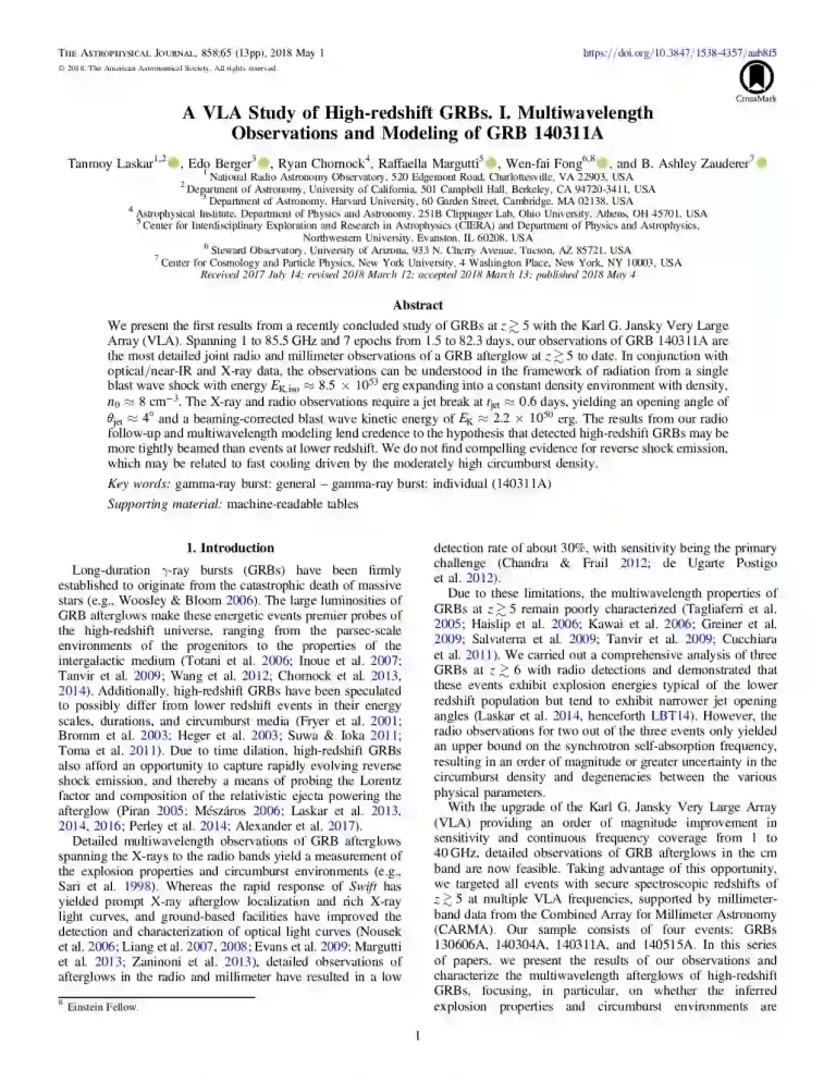 A VLA Study of High-redshift GRBs. I. Multiwavelength Observations and Modeling of GRB 35 30 View details Download