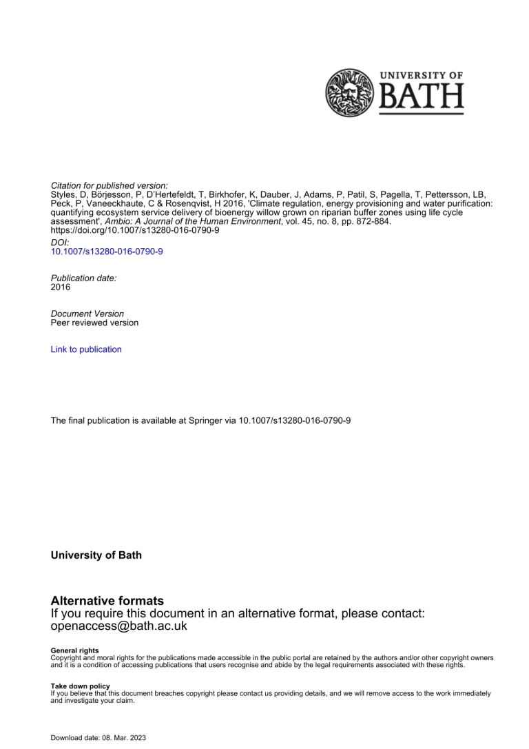 Climate Regulation, Energy Provisioning And Water Purification Quantifying Ecosystem Service Delivery Of Bioenergy Willow Grown On Riparian Buffer Zones Using Life Cycle Assessment 32 15 View details Download