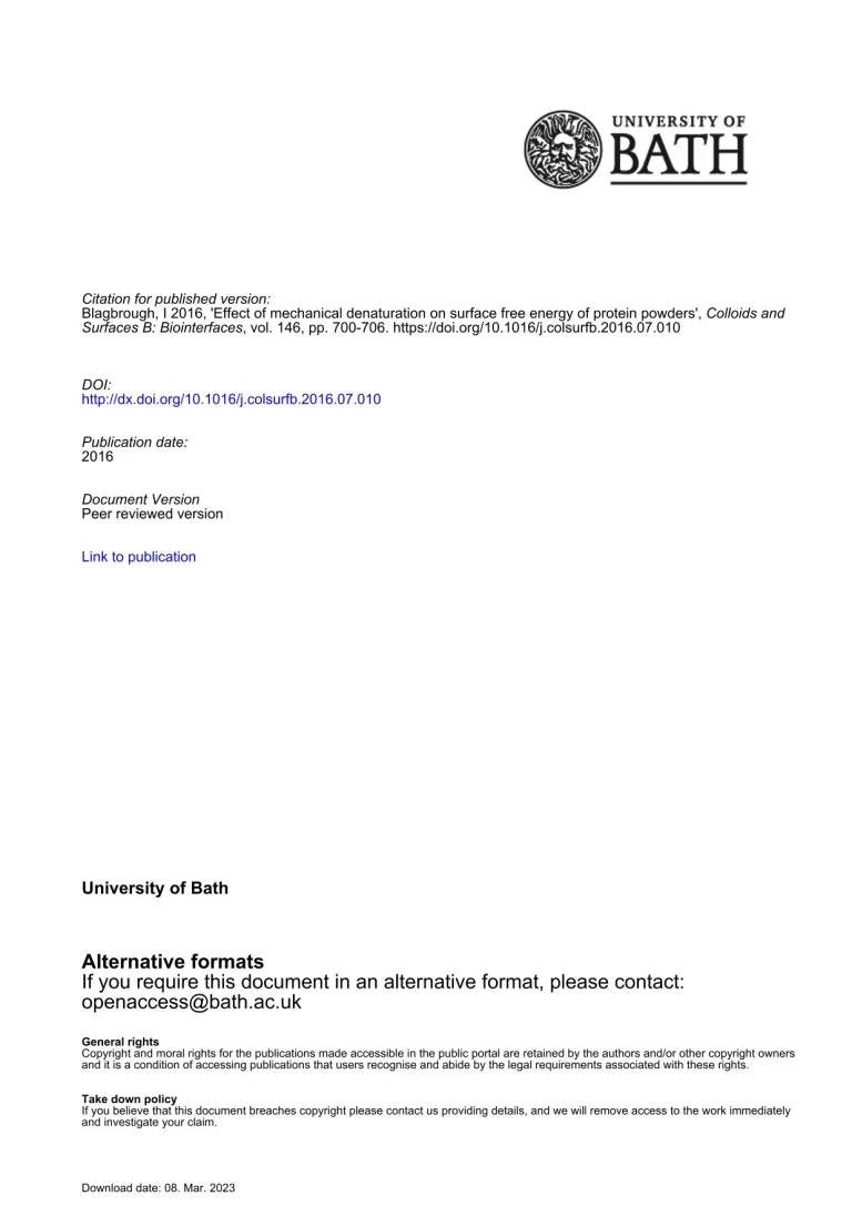 Colloids And Surfaces B Biointerfaces 146 (2016) 700-706 (October) Effect Of Mechanical Denaturation On Surface Free Energy Of Protein Powders 30 17 View details Download