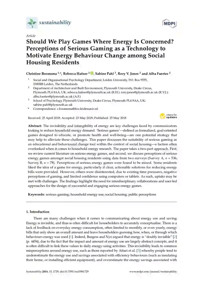 Should We Play Games Where Energy Is Concerned? Perceptions of Serious Gaming as a Technology to Motivate Energy Behaviour Change among Social Housing Residents 38 23 View details Download